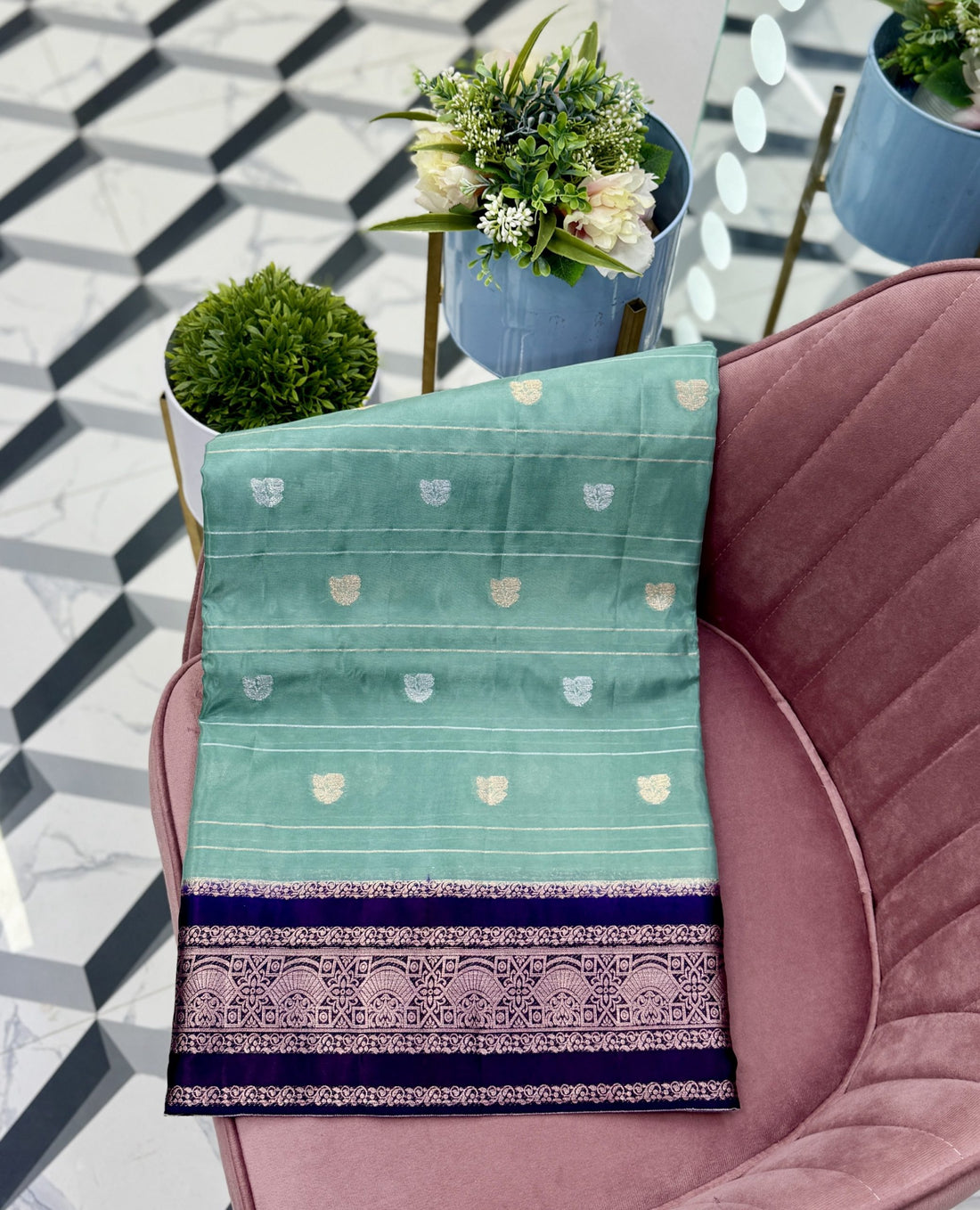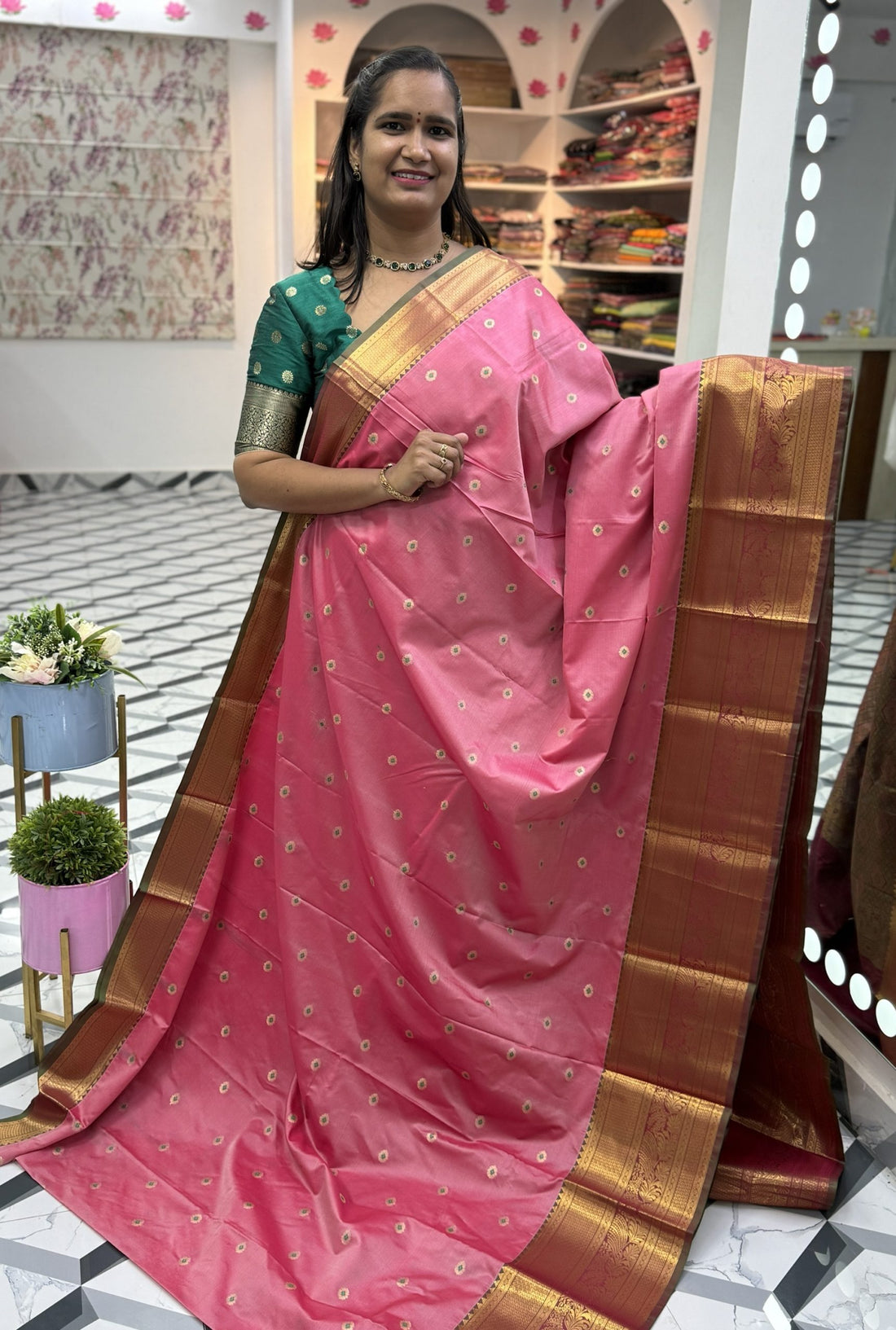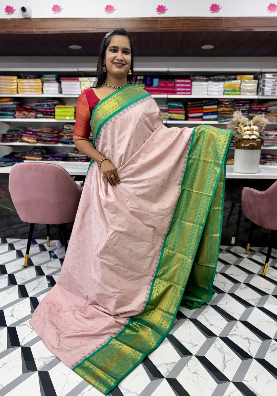 Saree: Semi Mysore Crepe Saree with Gold Zari Border and Allover Zari lines throughout the...