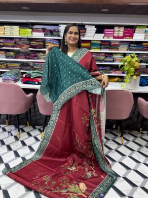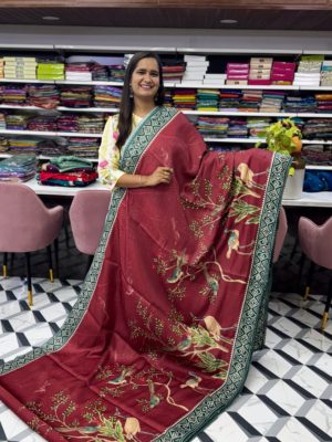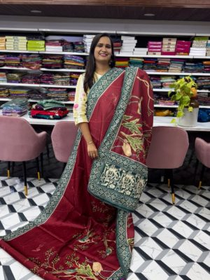 Saree: Premium Soft Tussar Saree with Digital Print, Contrast Border and Blouse