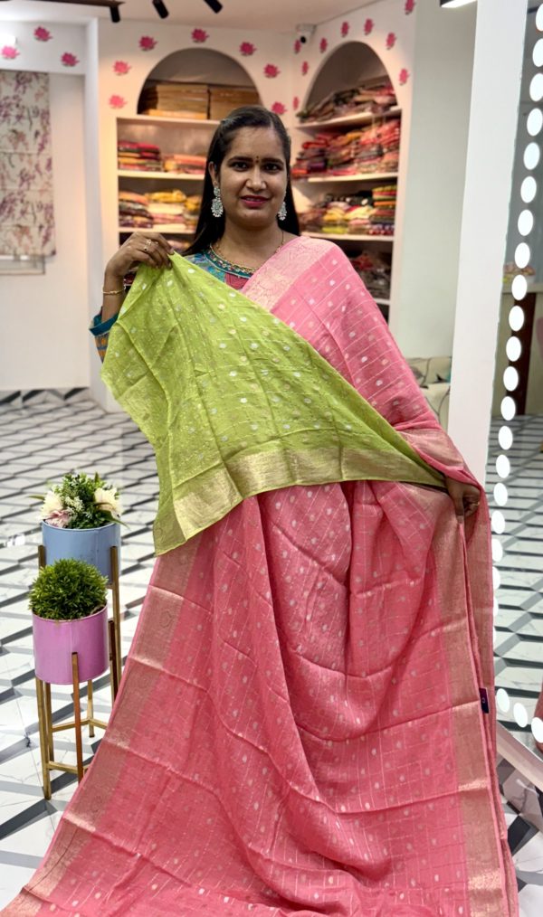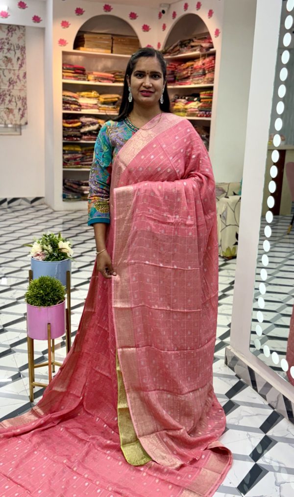 Saree: Premium Chinnon Saree with Checks and Booties allover with Gold Zari Border