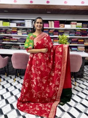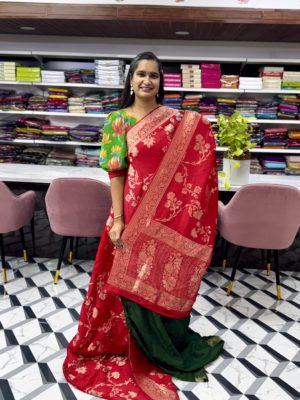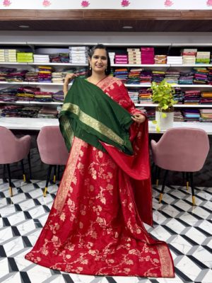 Saree: Banarasi Munga Silk Saree with Gold Zari Weaving and Contrast Blouse