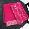 A crush tissue saree with cutdana work features a lightweight, textured fabric with shimmering cut glass bead embellishments. The subtle crinkle effect of the tissue fabric and the structured sparkle from the cutdana lines add a refined, elegant touch, making it perfect for festive and evening wear.